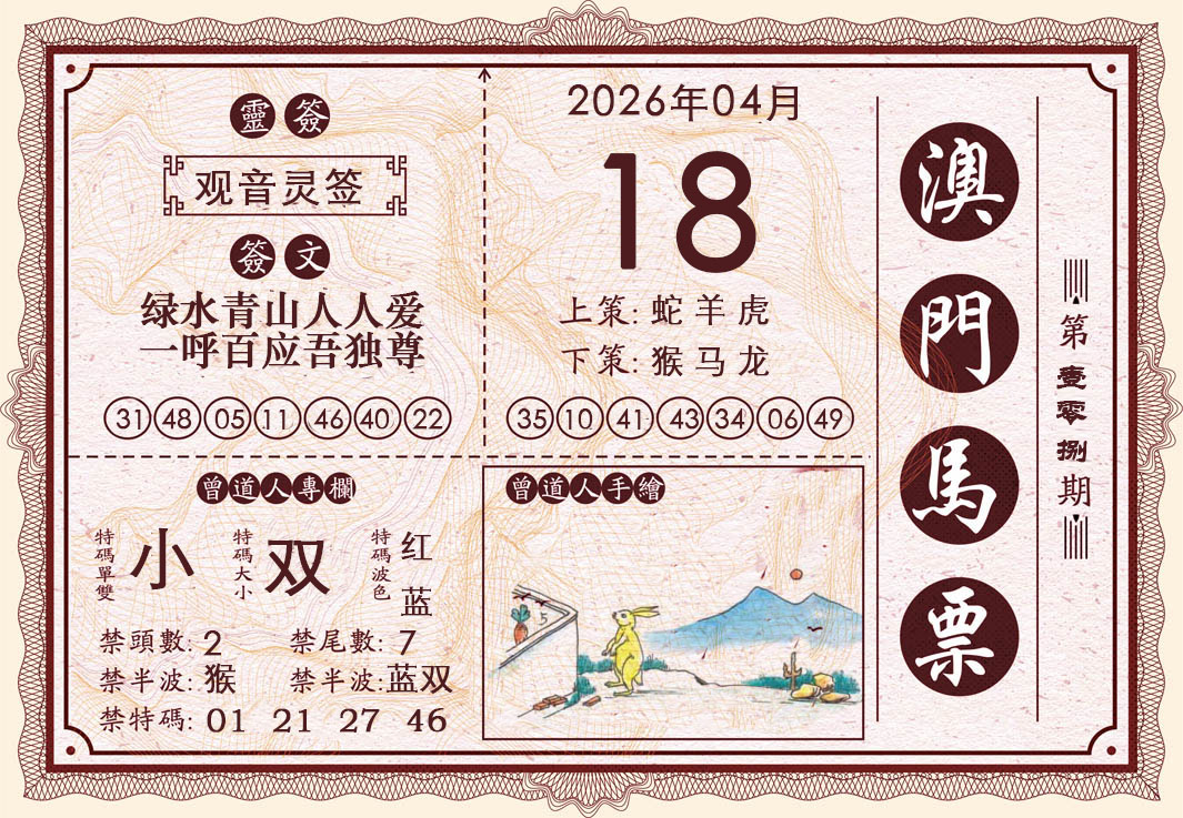 105期【单:马鼠虎猴+双:鸡牛兔羊】开:28兔准